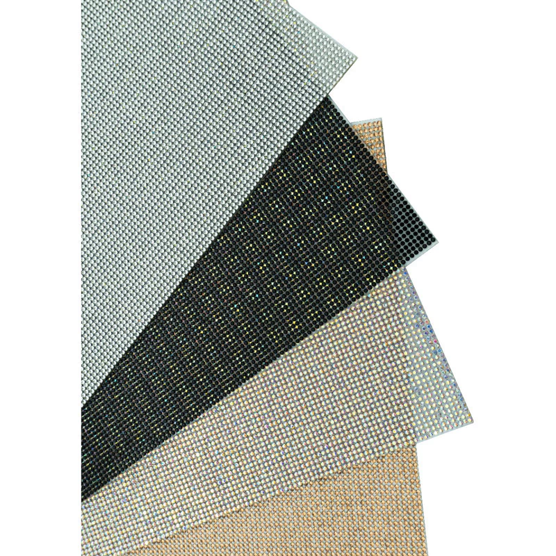 Planchas de Strass 40 X 24cm. compuestas por pequeñas piedras brillantes que se alinean en patrones regulares. Los strass están firmemente adheridos a una base flexible, lo que permite que se corten en formas específicas o se apliquen directamente sobre superficies curvas o planas. Sirve para la confección de calzado, marroquinería y decoración.